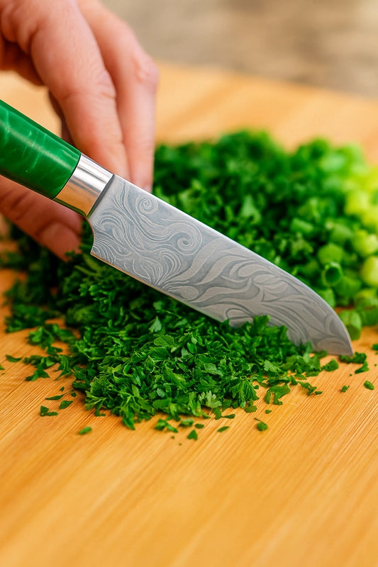 La lame du Couteau Kyoto est forgée en acier inoxydable de haute qualité, garantissant une netteté redoutable et une durabilité à toute épreuve. Préparez-vous à des années de découpes parfaites et sans effort !